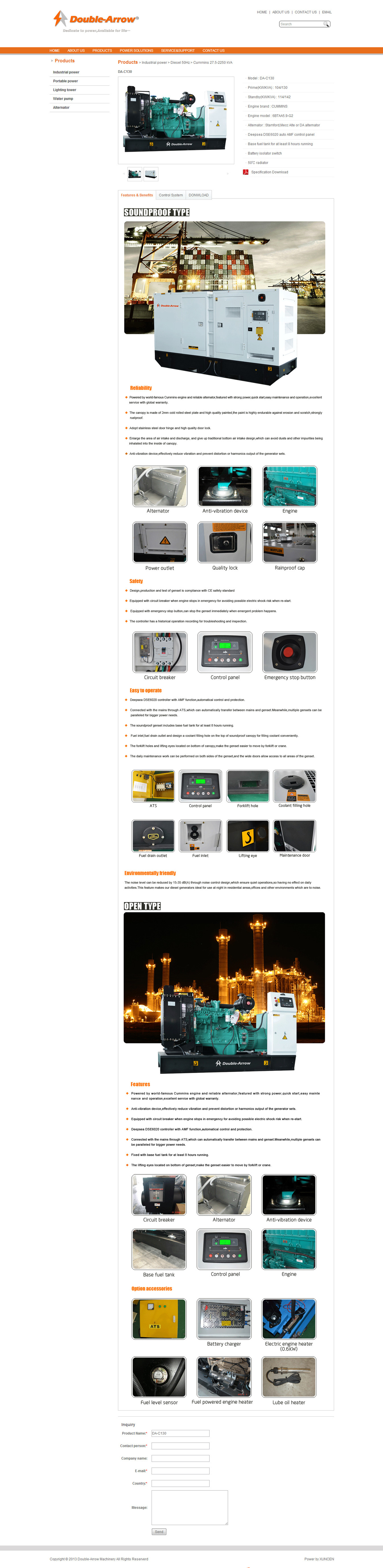訪問網(wǎng)站DOUBLE-ARROW is located in Wuxi, which is the flourishing area of the world manufacturing, an hour from Shanghai and two hours from Nanjing.DOUBLE-ARROW was established in 1999,and specialized in design,manufacture and after-sales service of diesel generating sets,lighting tower and alternator,meanwhile supply GCP,Transformer and maintenance kits as well,to provide the one-stop service to one-stop solution for customer.