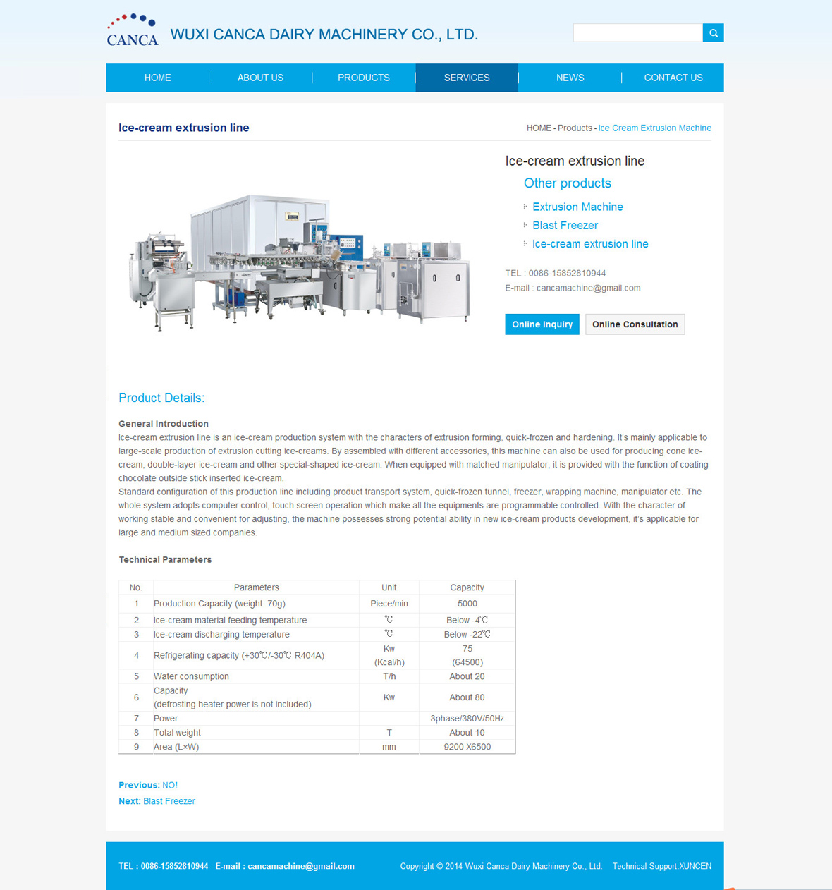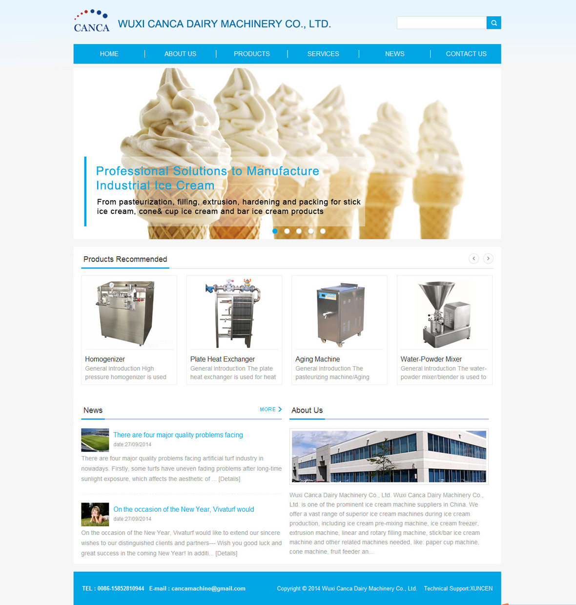 訪問(wèn)網(wǎng)站Wuxi Canca Dairy Machinery Co., Ltd. is one of the prominent ice cream machine suppliers in China. We offer a vast range of superior ice cream machines during ice cream production, including ice cream pre-mixing machine, ice cream freezer, extrusion machine, linear and rotary filling machine, stick/bar ice cream machine and other related machines needed, like: paper cup machine, cone machine, fruit feeder and more. We will provide you with a whole system from raw material preparation, ice cream freezing, ice cream forming, frozen until packing. Our machines are mainly used for continuous production of ice creams in different shapes and flavors. Efficient and reliable, machines are very popular with small and medium-sized ice cream companies and have been exported to many countries and regions, like: Russia, Turkey, Brazil, Thailand, Yemen, Iraq etc., which have won very good reputation among our customers.